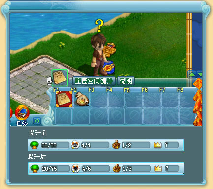 当人物级别达到6级或以上,可以到城镇上寻找升级管理员升级庄园空间,升级管理员会给出升级条件提示。