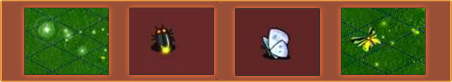 野外昆虫:蝴蝶、萤火虫等飞虫会在野外出现,玩家手持捕虫网可以捕捉到相应的昆虫。蝴蝶只在白天出现,萤火虫在夜晚出现,但是在碰上雨雪天气时她们就都不会出现了。