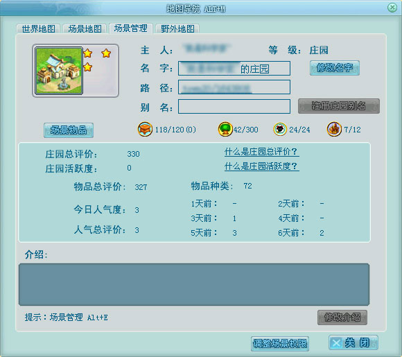 打开场景管理界面,可以查看当前庄园的总评价值、物品评价、人气评价、庄园路径等详细信息。同时可以修改庄园名称和庄园介绍。