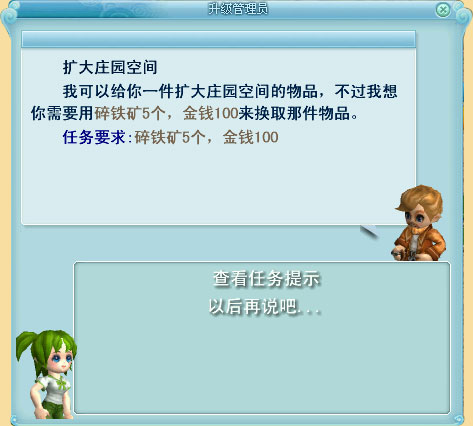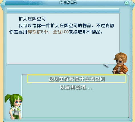 准备好升级所需物品并放在背包栏后,需要再次找到“升级管理员”点选扩大庄园空间。之后会出现“我现在就要提升庄园空间”按钮。选择“以后再说吧…”则放弃此任务。之后可以找“升级管理员”重新接任务。