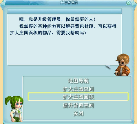 如果庄园内使用面积不够用时,可以寻找“升级管理员”进行庄园面积提升的任务。