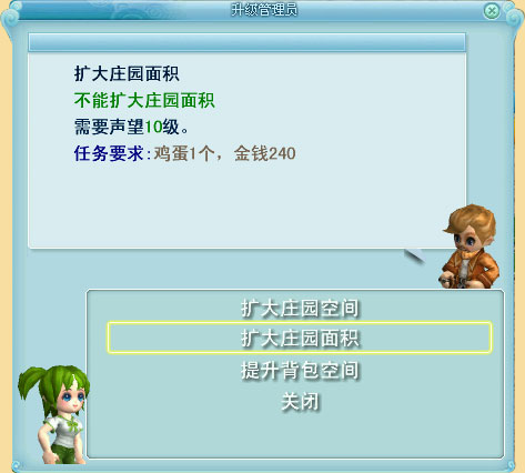 选择扩大庄园面积后,会出现升级任务。如果玩家人物声望等级及爵位等级尚未达到升级要求时,“升级管理员”是不会受理升级任务的。所以还需要多多努力提高。