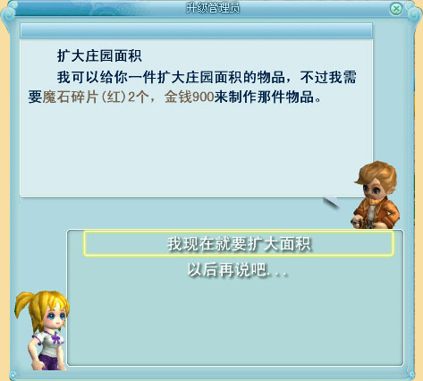 准备好升级所需物品并放在背包栏后,需要再次找到“升级管理员”点选扩大庄园空间。之后会出现“我现在就要扩大面积”按钮。选择“以后再说吧…”则放弃此任务。之后可以找“升级管理员”重新接任务。